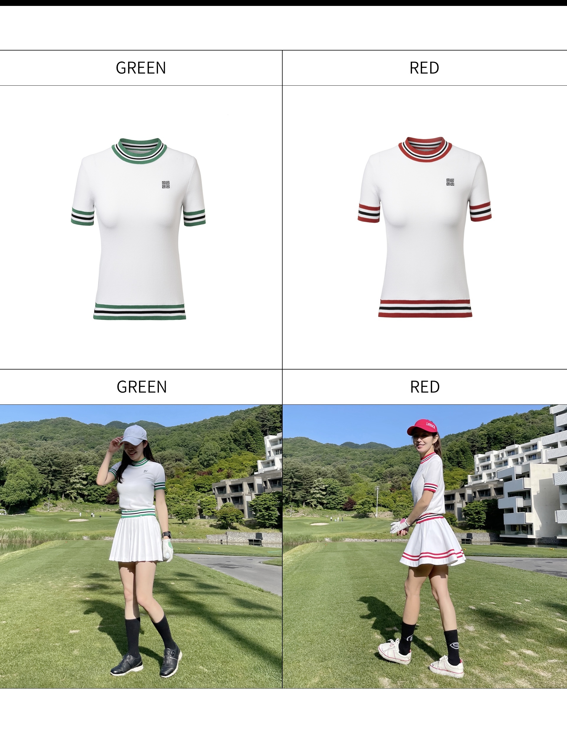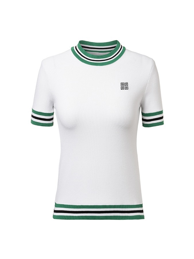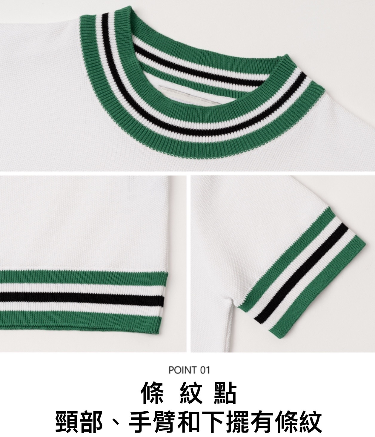 2.這是一款短袖針織衫,風格活潑, 讓人想起學校造型,頸部和手 臂上有條紋,修身剪裁。