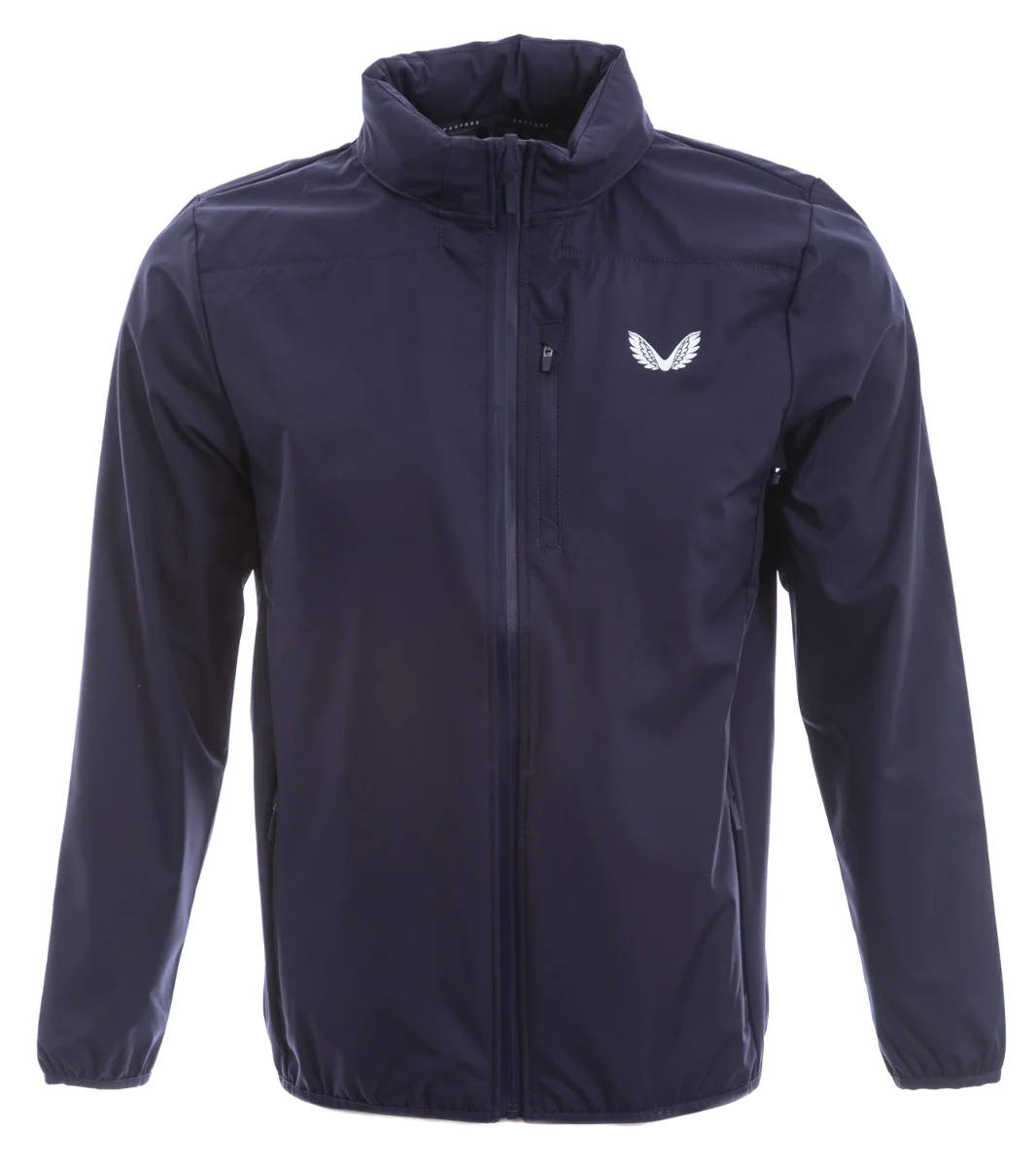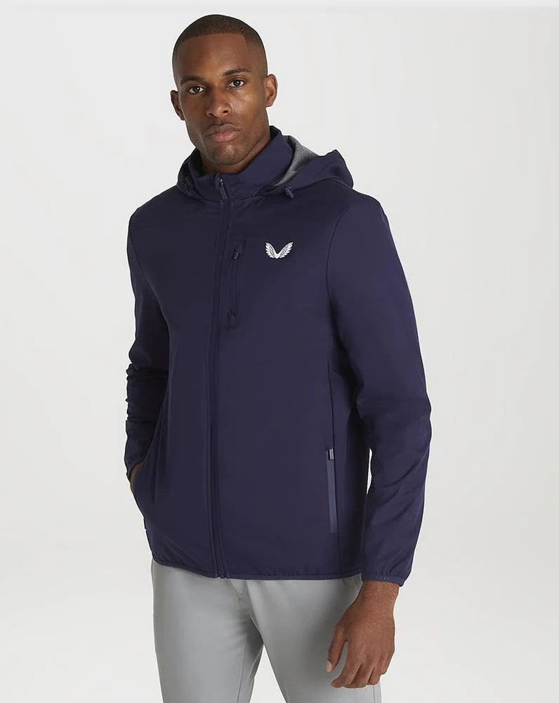 Castore Golf 輕質軟殼夾克。 Castore 的這款輕質夾克既防水又透氣。 兩個側拉鍊口袋和一個拉鍊胸袋。 隱藏式兜帽配有栓扣,可調節合身度。 胸部和左袖印有 Castore 標誌。 腰部和袖口飾有鬆緊帶飾邊,印有同色系品牌標識。