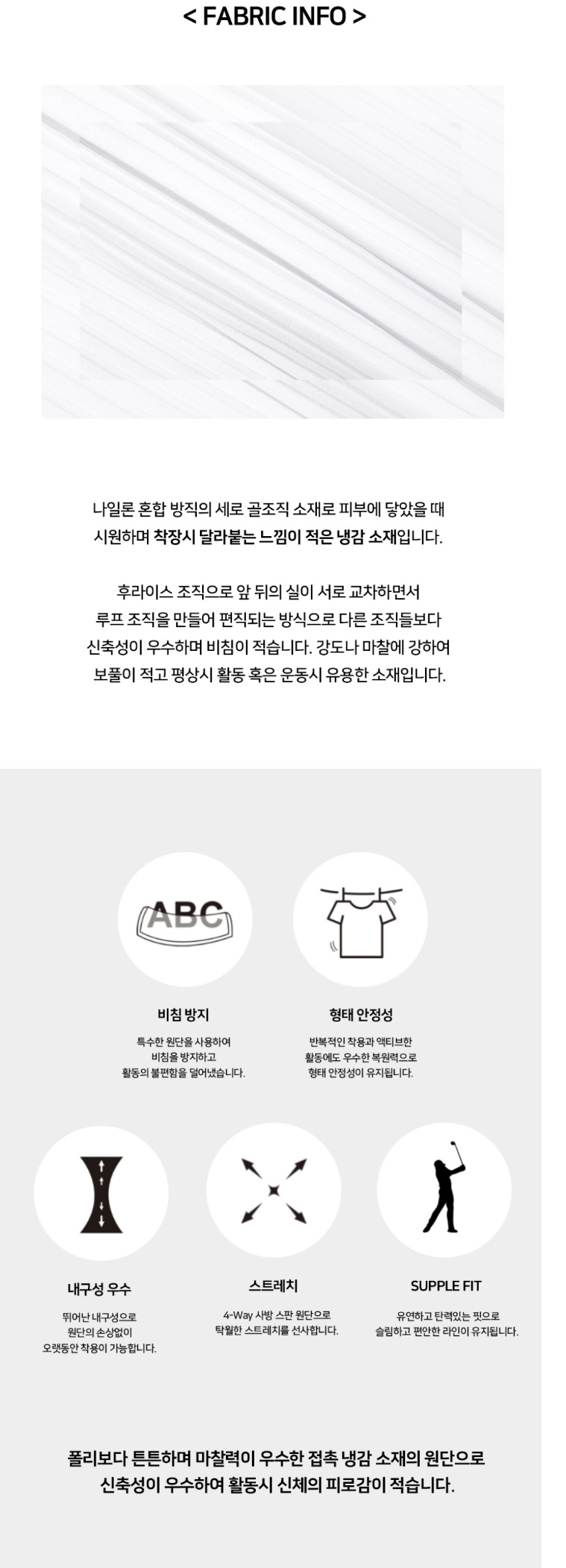 是由尼龍混紡製成的垂直骨組織材料,接觸皮膚時涼爽,佩戴時粘膩感較小。 具有褶邊紋理,正面和背面線相互交叉。 它採用毛圈結構編織而成,因此比其他組織具有更好的彈性,柔軟貼合,且不易透視。它是一種強度和摩擦力強、絨毛少、適合日常活動或運動的材料。