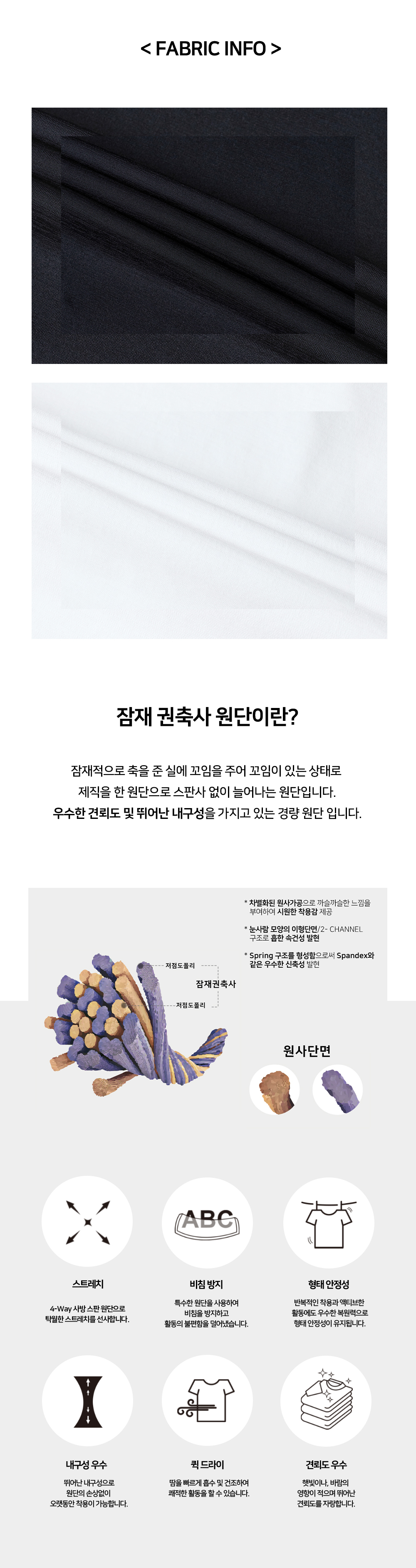 設計材質是採用「潛在捲曲紗布料」。顏色 黑色的 尺寸 它是透過加撚潛在軸向線以加撚狀態織成的織物,並且是一種無需氨綸即可拉伸的織物。它是一種輕質面料,具有出色的牢度和耐用性。