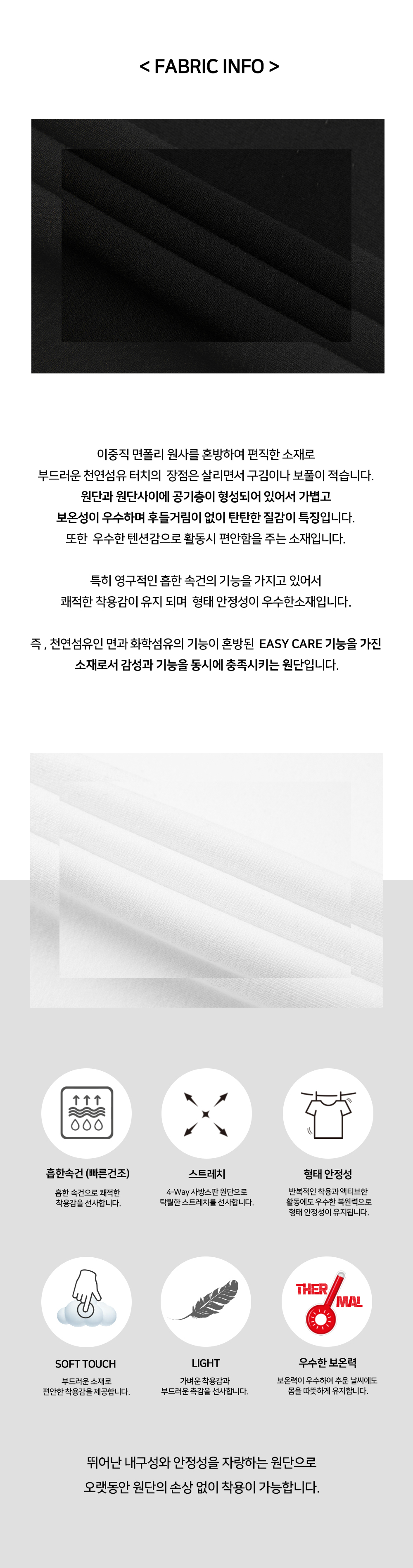 這種材質採用雙面聚酯紗線混紡而成,保留了柔軟天然纖維觸感的優點,同時減少了皺紋和絨毛。布料之間形成空氣層,因此重量輕,保暖性優良,質地堅牢不飄逸。它也是一種在活動中提供舒適感並具有出色張力的材料。 特別是它具有永久的吸汗和快乾功能,因此保持舒適的貼合性,是一種形狀穩定性優異的材料。 換句話說,它是一種具有EASY CARE功能的材料,結合了棉、天然纖維和化學纖維的功能,是一種同時滿足情感和功能的織物。