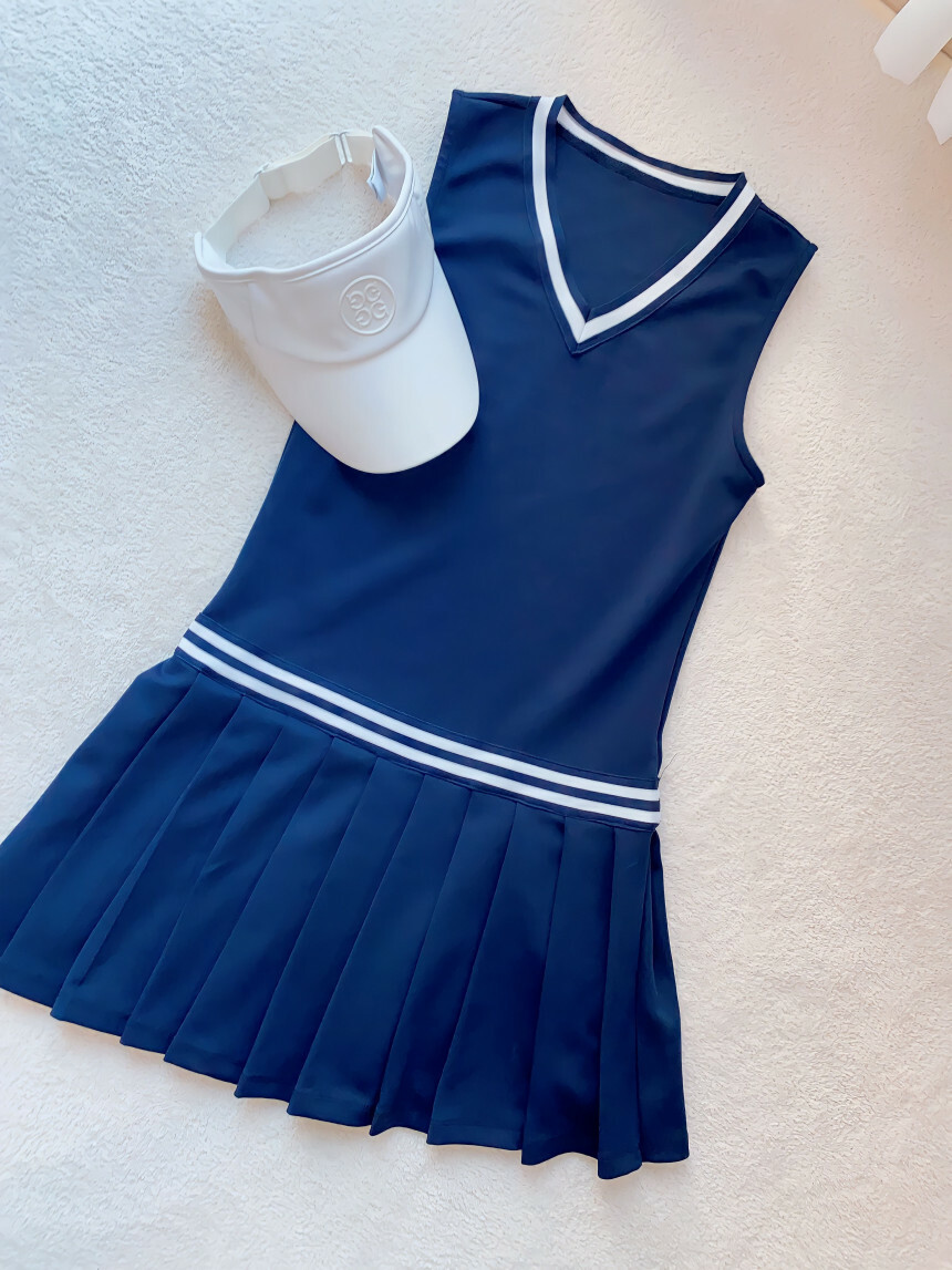 女 303M 正韓設計師 學院風格V領線條連身無袖洋裝 多巴胺連身無袖洋裝