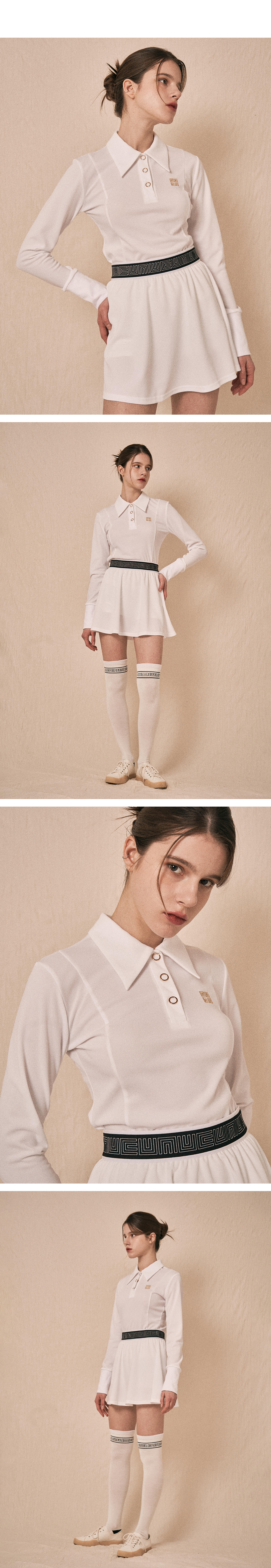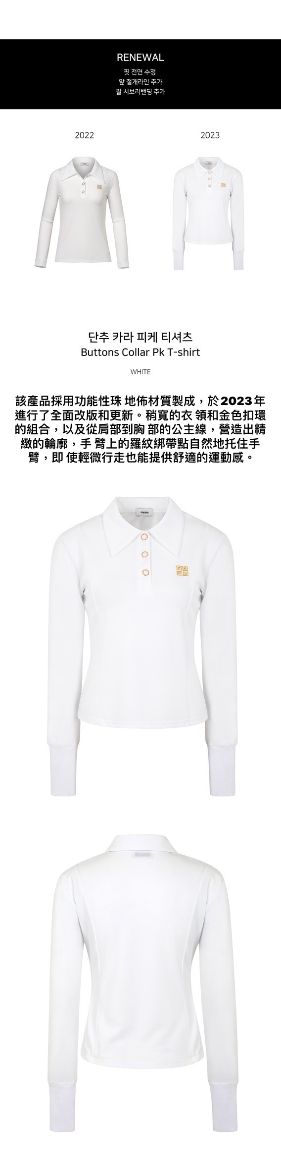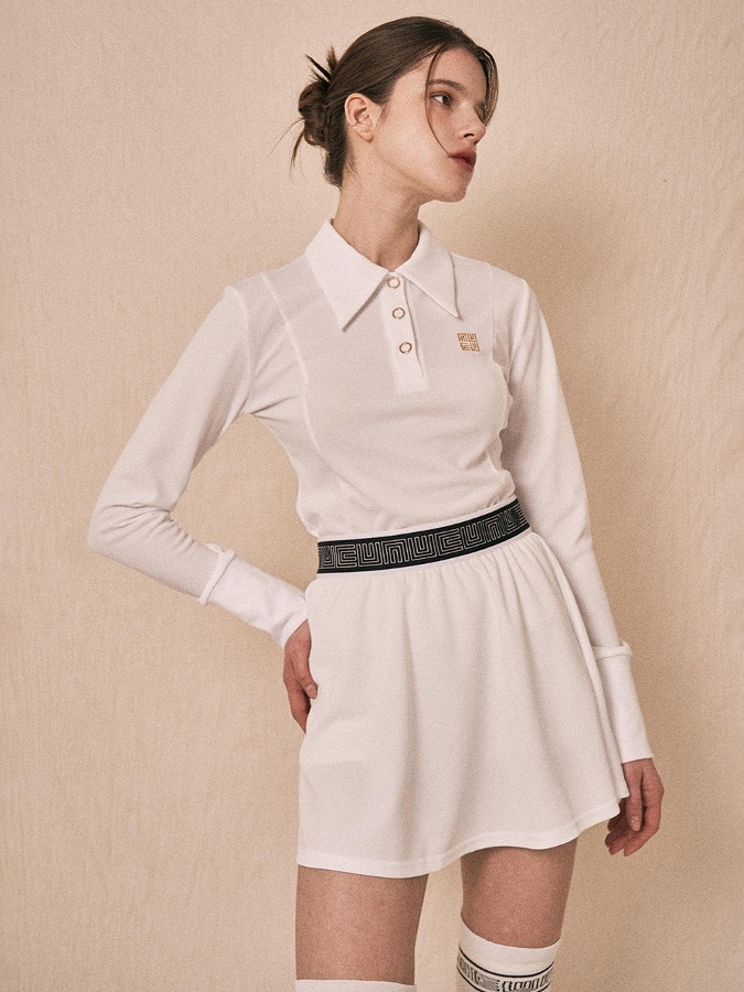 女 304M 正韓設計師 低調奢華風格 復古大領Polo衫長袖/高爾夫球衣(白色)