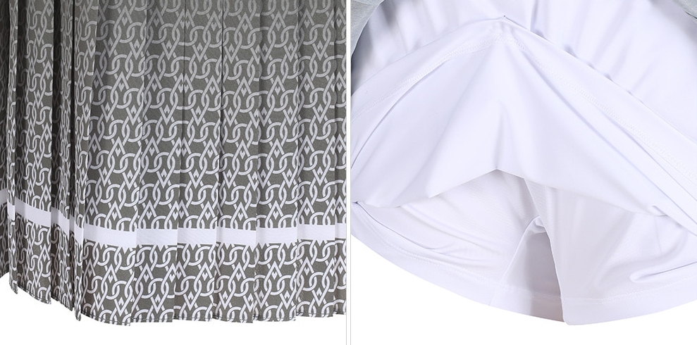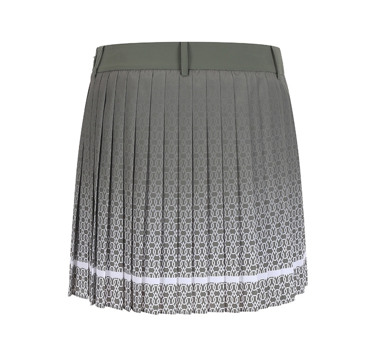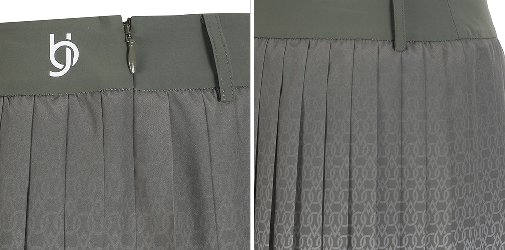 1.百褶熱銷款式,裙褲以滿版信鍊標誌做設計。