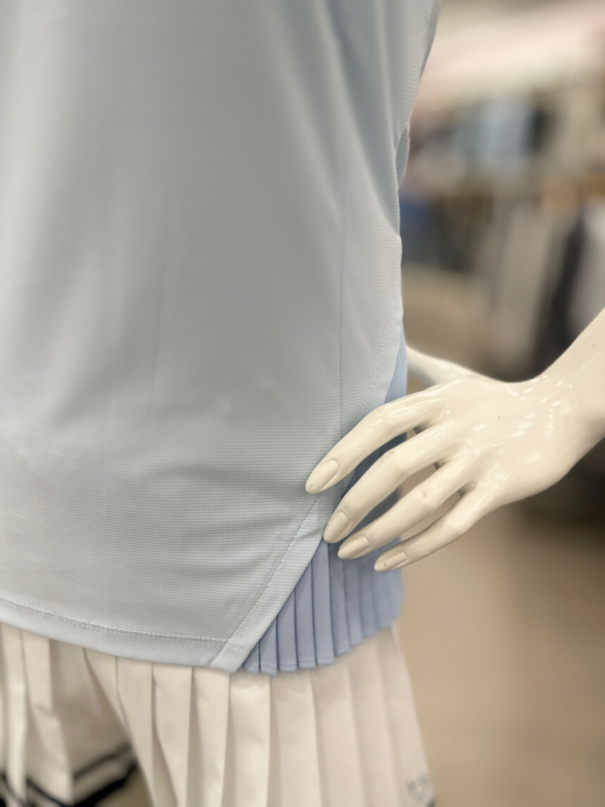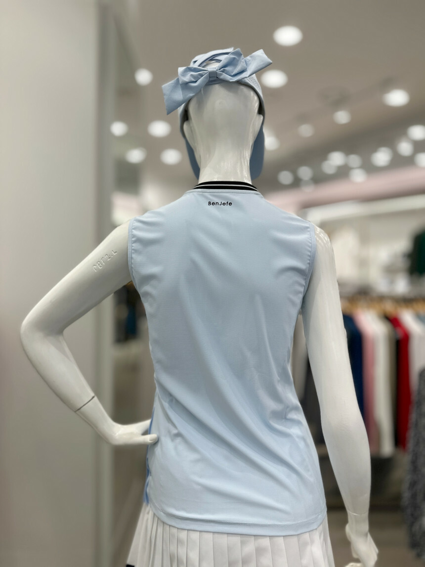 1. 本款新裝春夏高球新款無袖T卹,領口邊沿用線條點綴,上衣側邊摺邊百摺樣式細節別緻,打造個人穿搭清新活力的感覺。