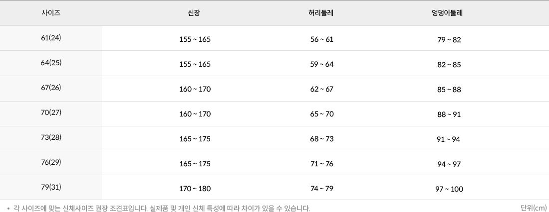 「褲子&裙子」尺寸對照:61/24腰,64/25腰,67/26腰,70/27腰,73/28腰,76/29腰,79/30腰